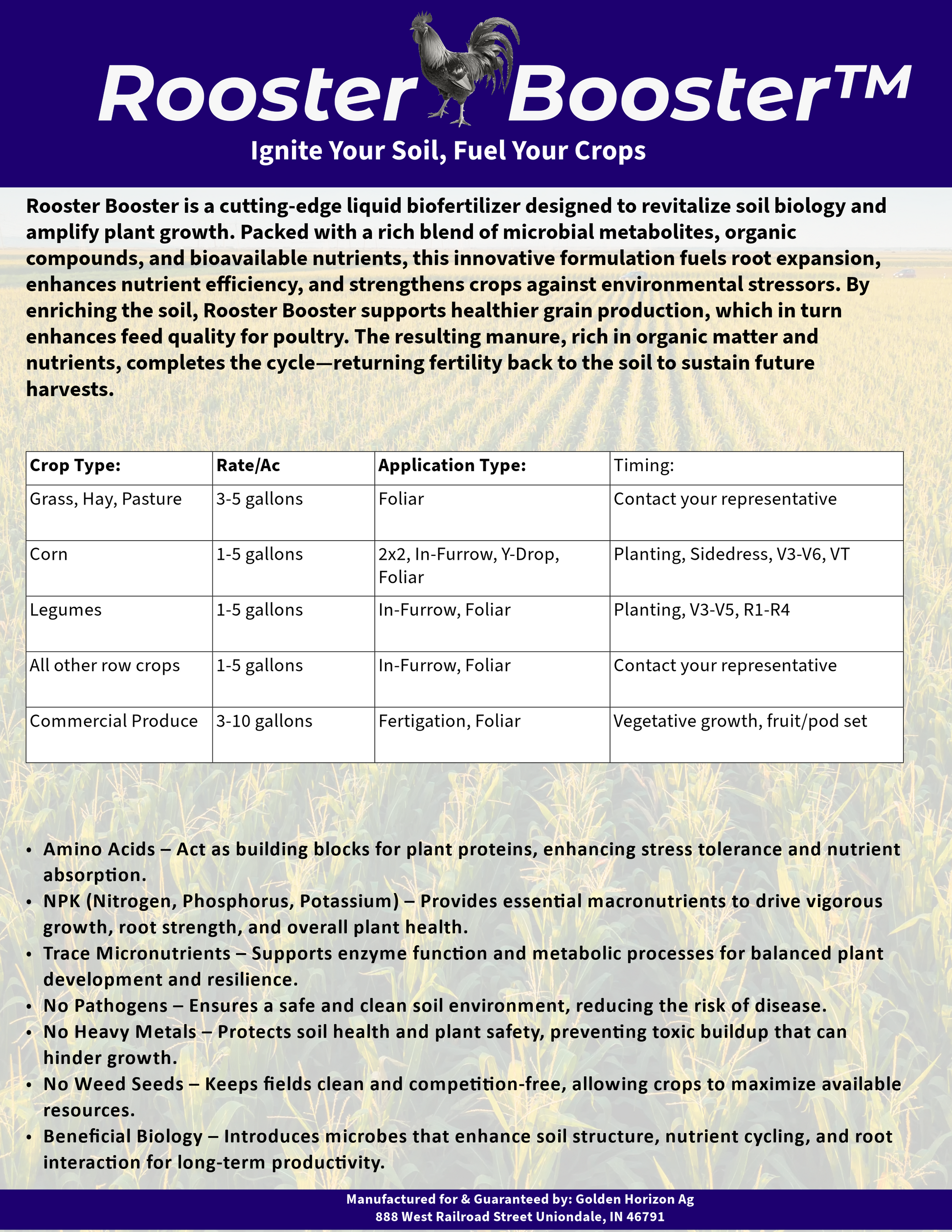Rooster Booster™ is a cutting-edge liquid biofertilizer designed to revitalize soil biology and amplify plant growth. Packed with a rich blend of microbial metabolites, organic compounds, and bioavailable nutrients, this innovative formulation fuels root expansion, enhances nutrient efficiency, and strengthens crops against environmental stressors. By enriching the soil, Rooster Booster™ supports healthier grain production, which in turn enhances feed quality for poultry. The resulting manure, rich in organic matter and nutrients, completes the cycle—returning fertility back to the soil to sustain future harvests.